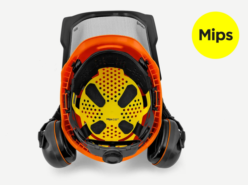 • Technischer Helm von Husqvarna mit Mips®-Sicherheitssystem für Forsthelme. Das Mips®-System ist so konzipiert, dass es Bewegungen am Helm ermöglicht, um die Rotationsbewegung bei bestimmten Aufprallwinkeln vom Kopf weg zu leiten.